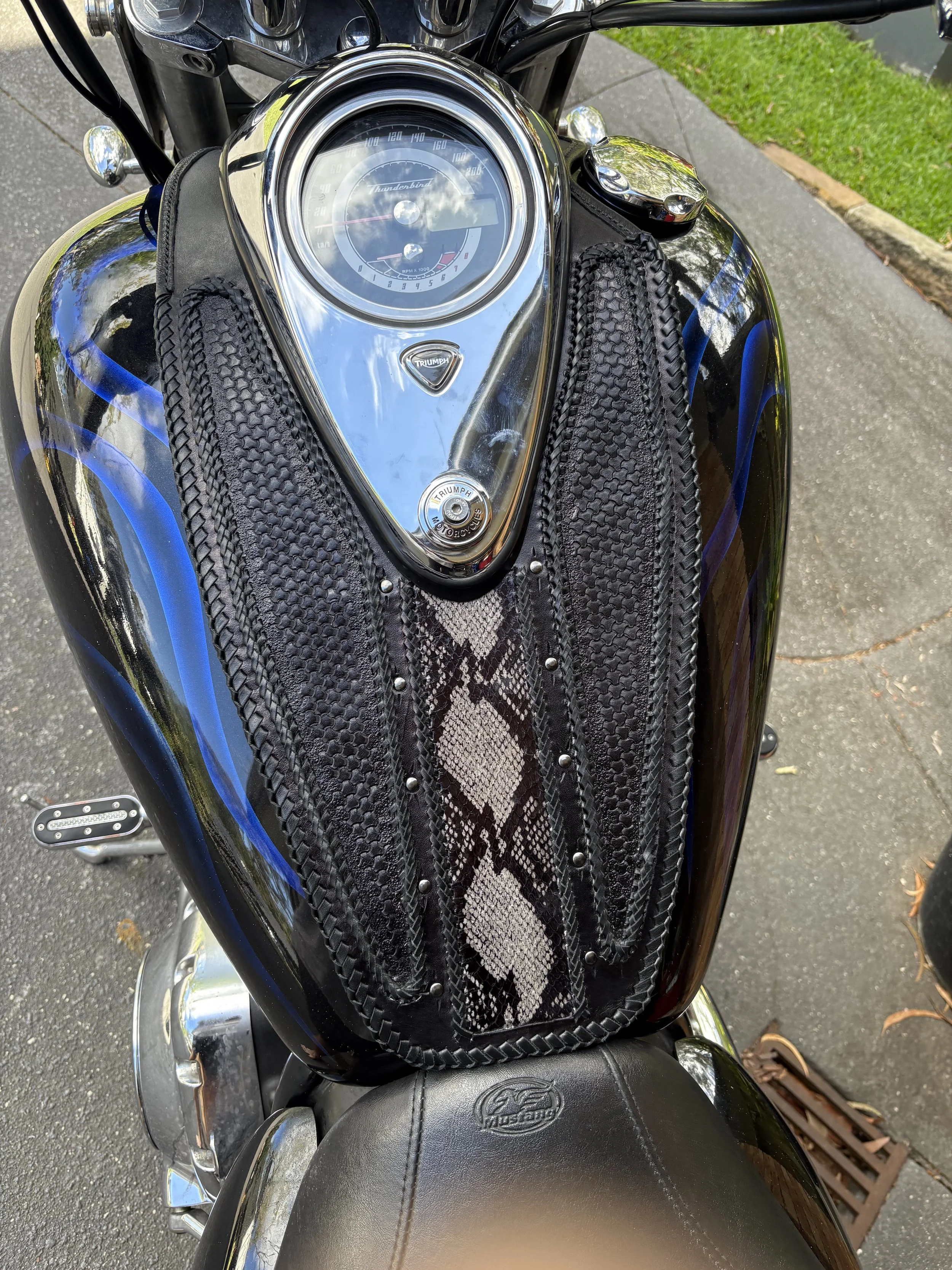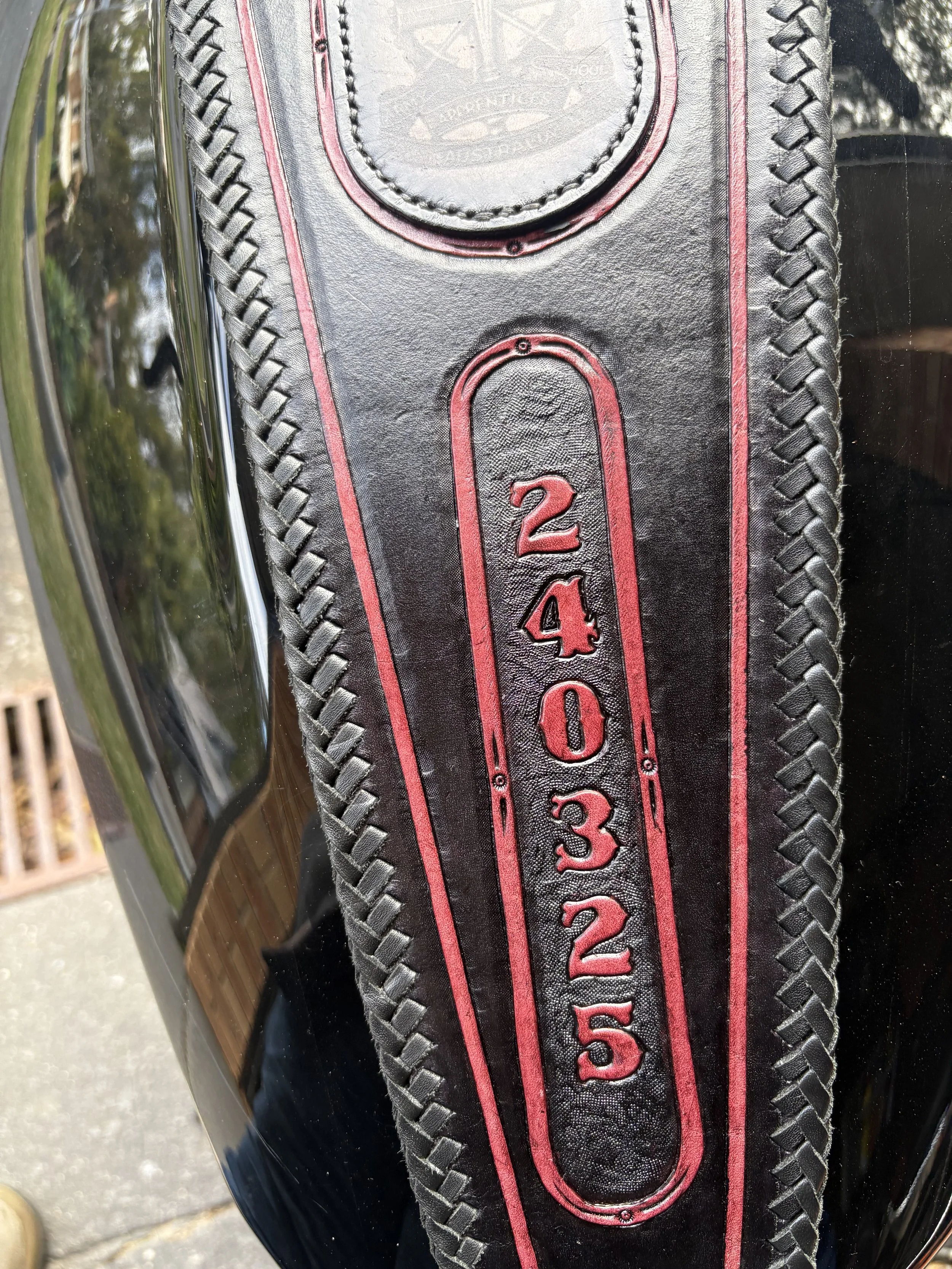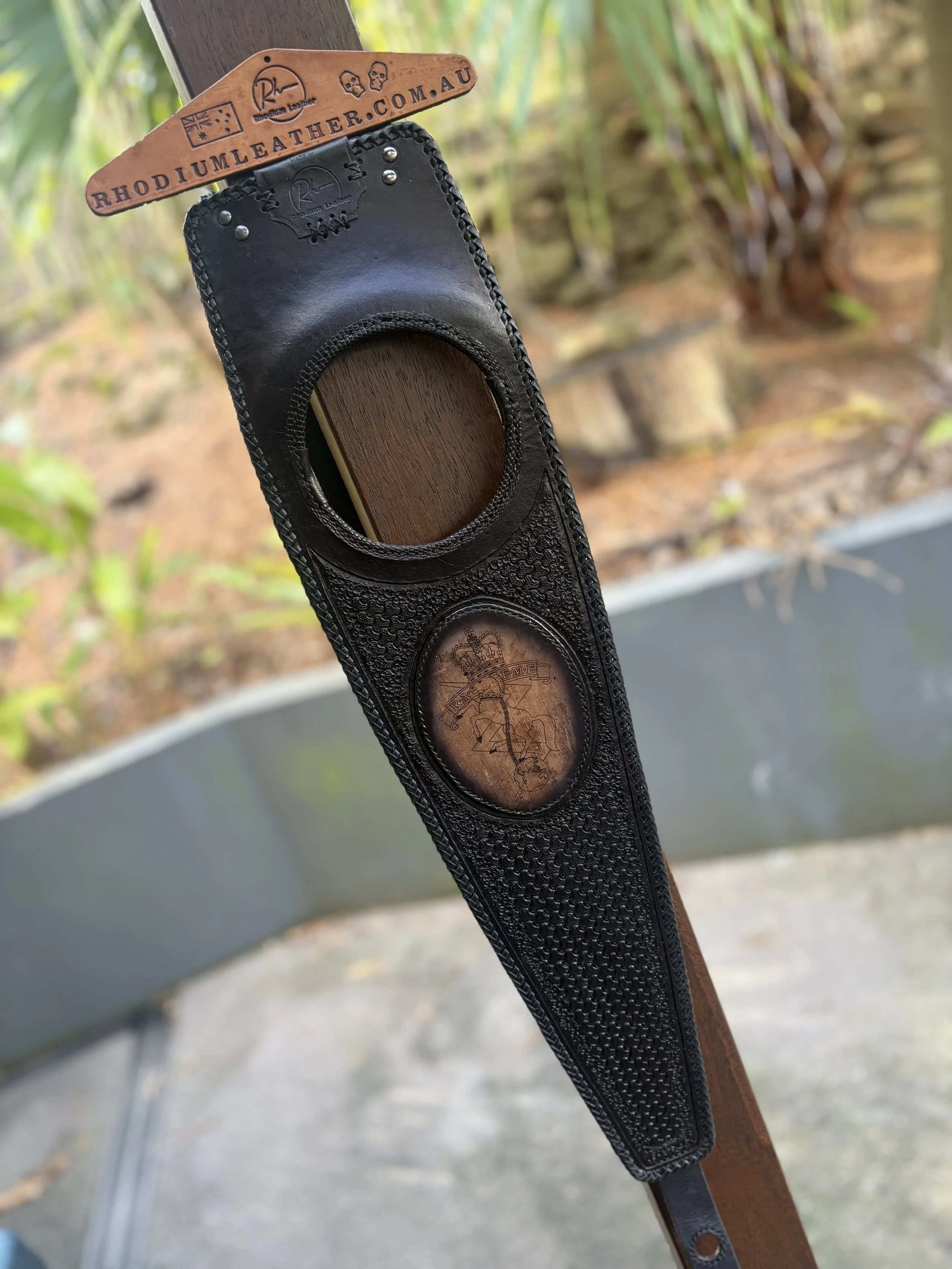 Tell us what kind of things you like … hand carved images, laser etched images, plain black or multiple coloured braiding, studs, spikes, conchos, exotic skins (such as ostrich, snake, lizard, crocodile), stamped patterns.