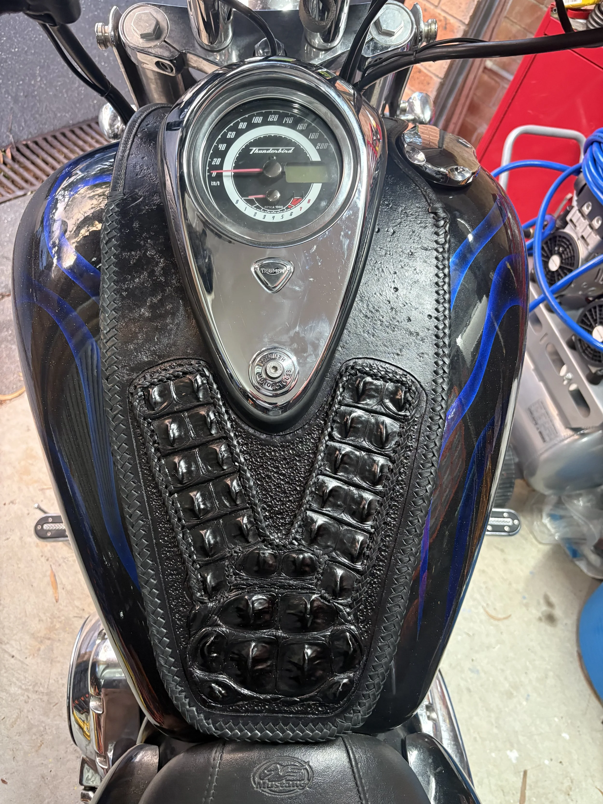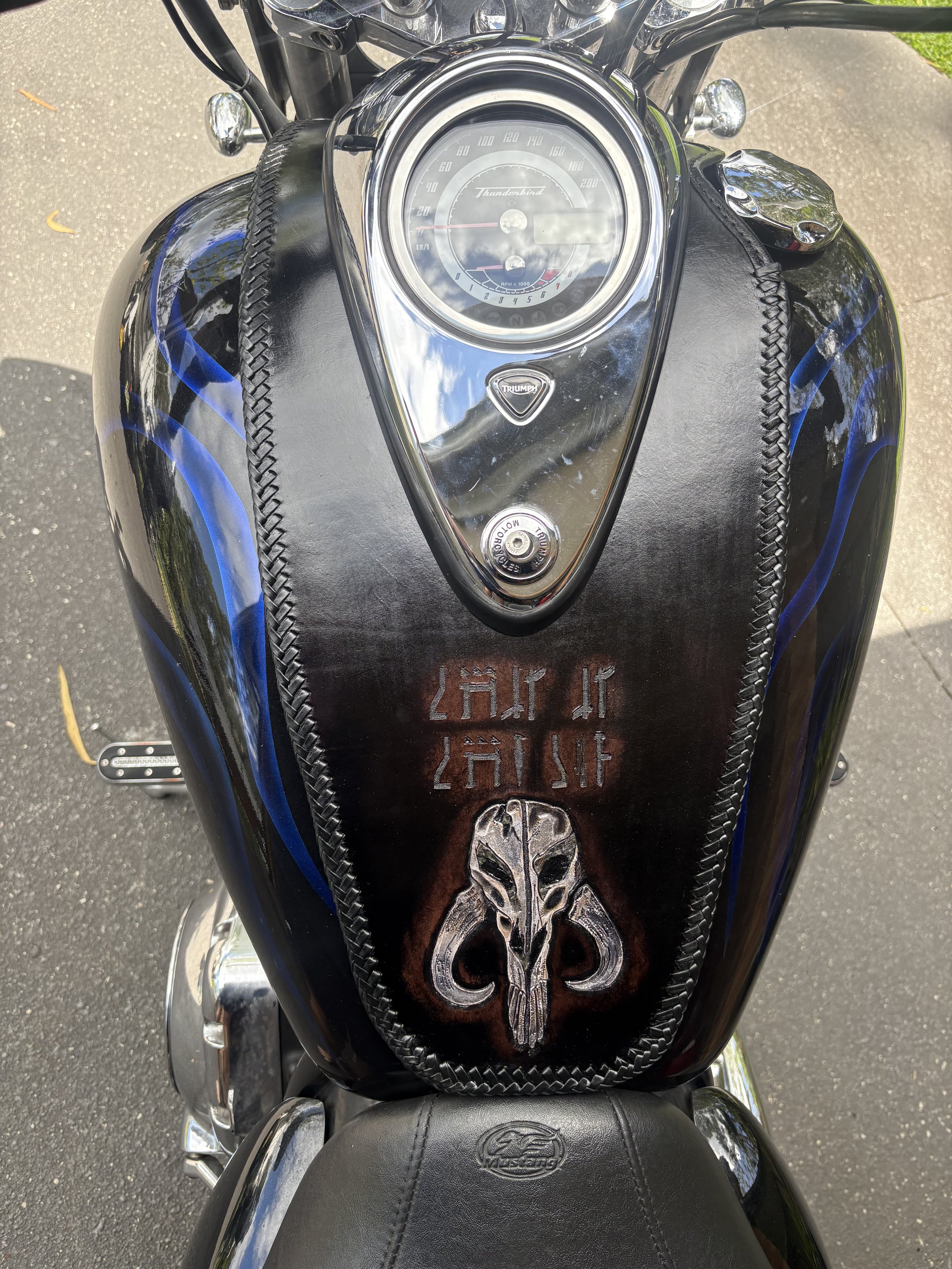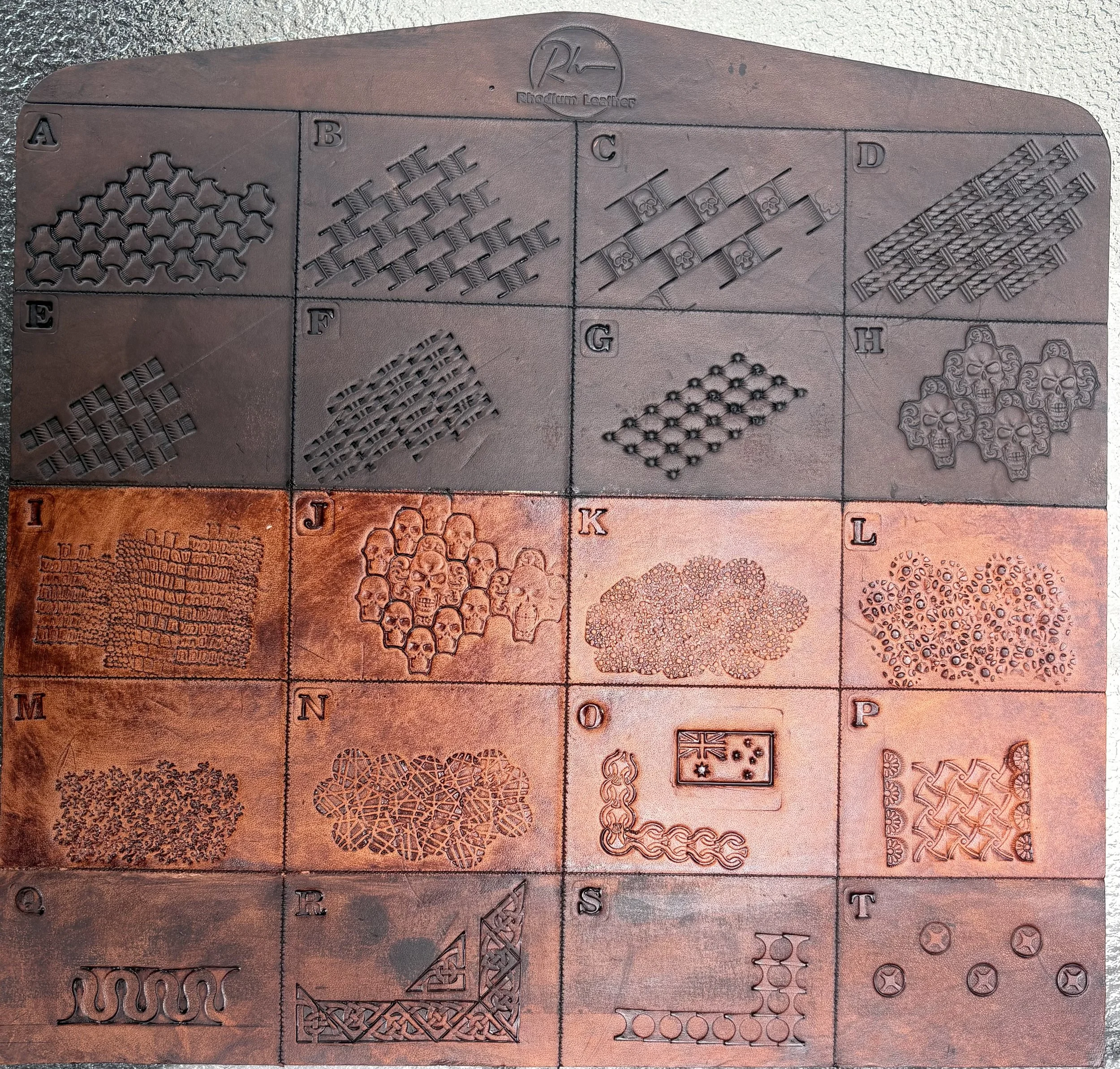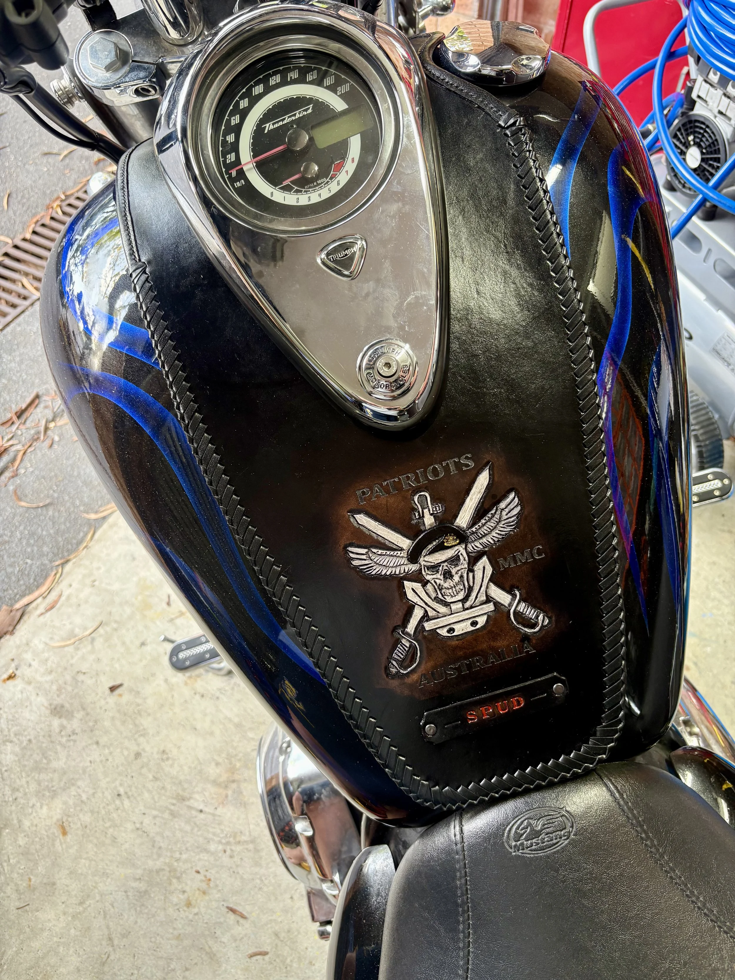 Tell us what kind of things you like … hand carved images, laser etched images, plain black or multiple coloured braiding, studs, spikes, conchos, exotic skins (such as ostrich, snake, lizard, crocodile), stamped patterns.